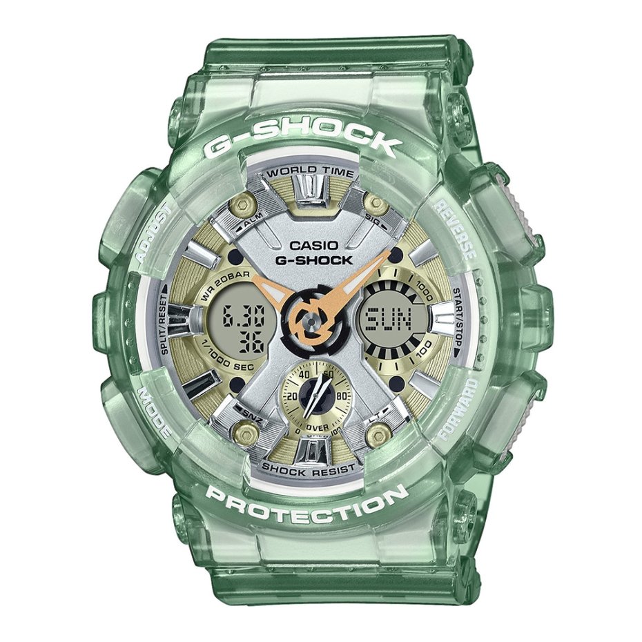 Модела GMA-S120GS-3AER е изключително стилен и функционален часовник, който съчетава в себе си здравина и елегантност. Корпусът и каишката са изработени от висококачествен полимерен материал, който осигурява лекота и комфорт при носене, като същевременно гарантира дълготрайна устойчивост. Минералното стъкло, което покрива дисплея, е устойчиво на надраскване, осигурявайки безупречен вид на часовника дори след продължителна употреба.