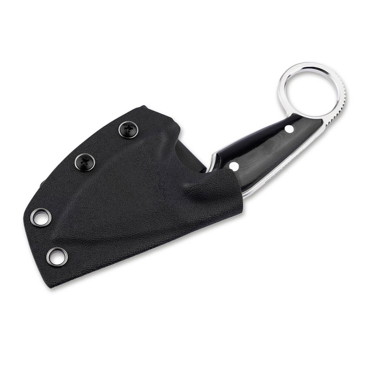 Дръжката на ножа е изработена от устойчиви материали, които осигуряват стабилно захващане и комфорт при употреба. Дизайнът на ръкохватката е специално проектиран, за да предотврати приплъзването и да осигури оптимален контрол върху ножа дори при влажни или мързеливи условия.